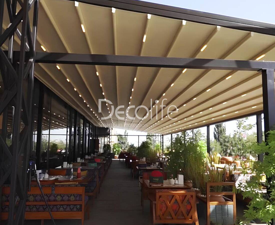 In pergolas covered with awning fabric, a special waterproof, elastic, resistant to mechanical damage material is used.